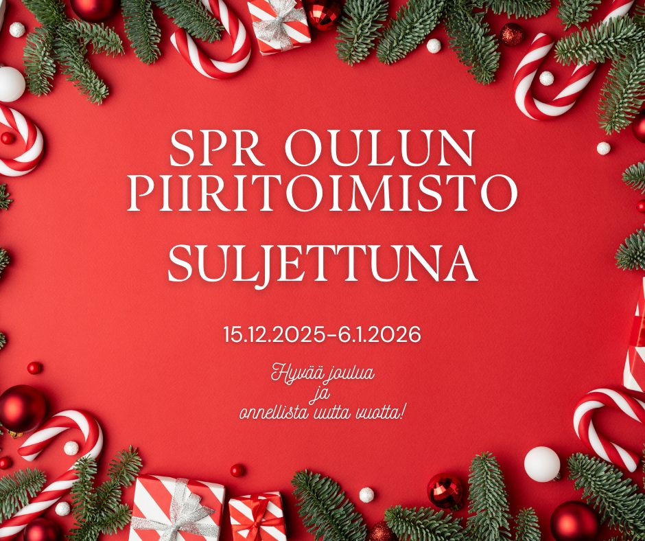 SPR Oulun piiritoimistolla rauhoitutaan joulun aikaan 15.12. - 6.1. väliseksi ajaksi. Tällöin piiritoimisto on suljettuna. Vuoden 2026 alusta lähtien otamme käyttöön piiritoimiston uudet aukioloajat.